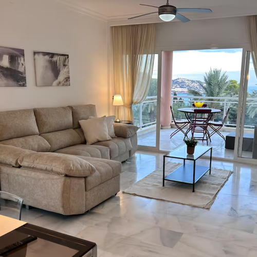 Estupendo piso con vistas a la zona de jardín y a la espectacular bahía de La Herradura, el piso tiene dos amplias terrazas, tres amplios dormitorios, uno de ellos en suite, y con vestidor, los tros dos con buenas vistas y grandes ventanas, cocina super equipada, con lavavajillas y horno, lavadero aparte, gran salón con estupendo sofá y tv smart tv, internet de alta velocidad. Especial teletrabajadores.